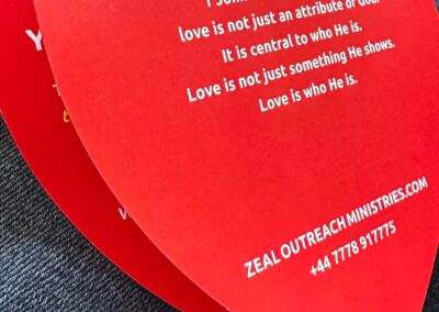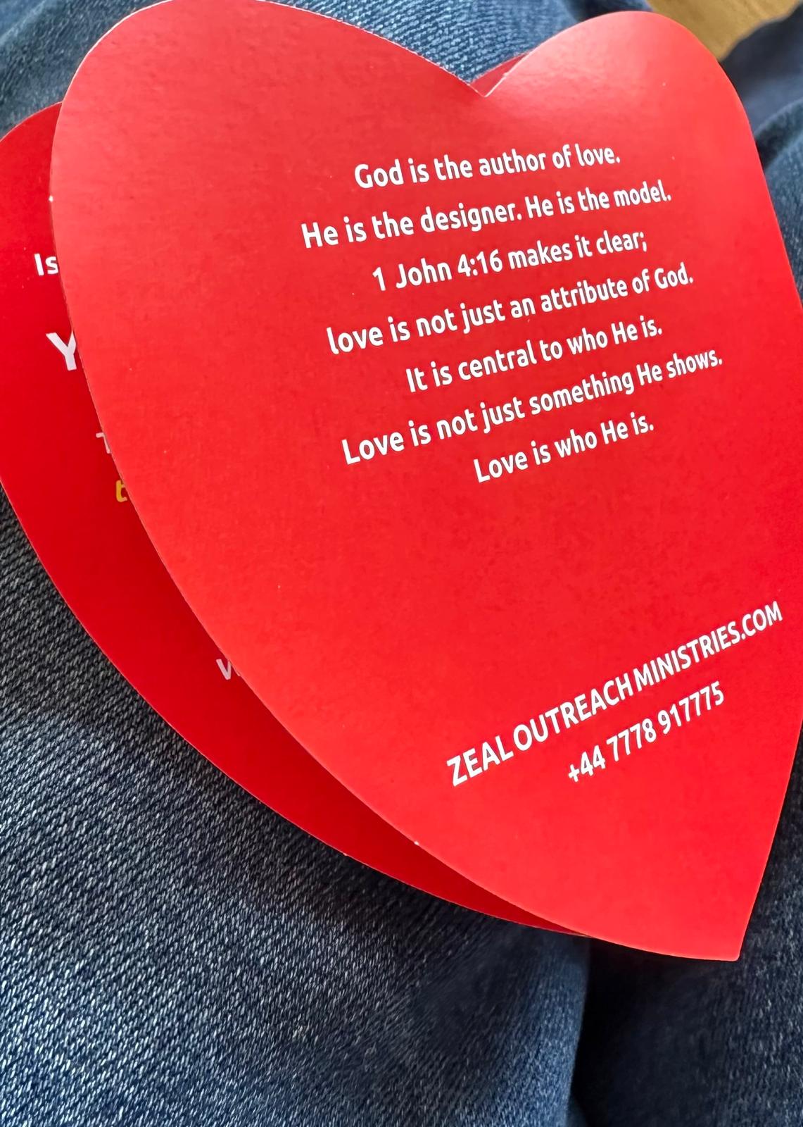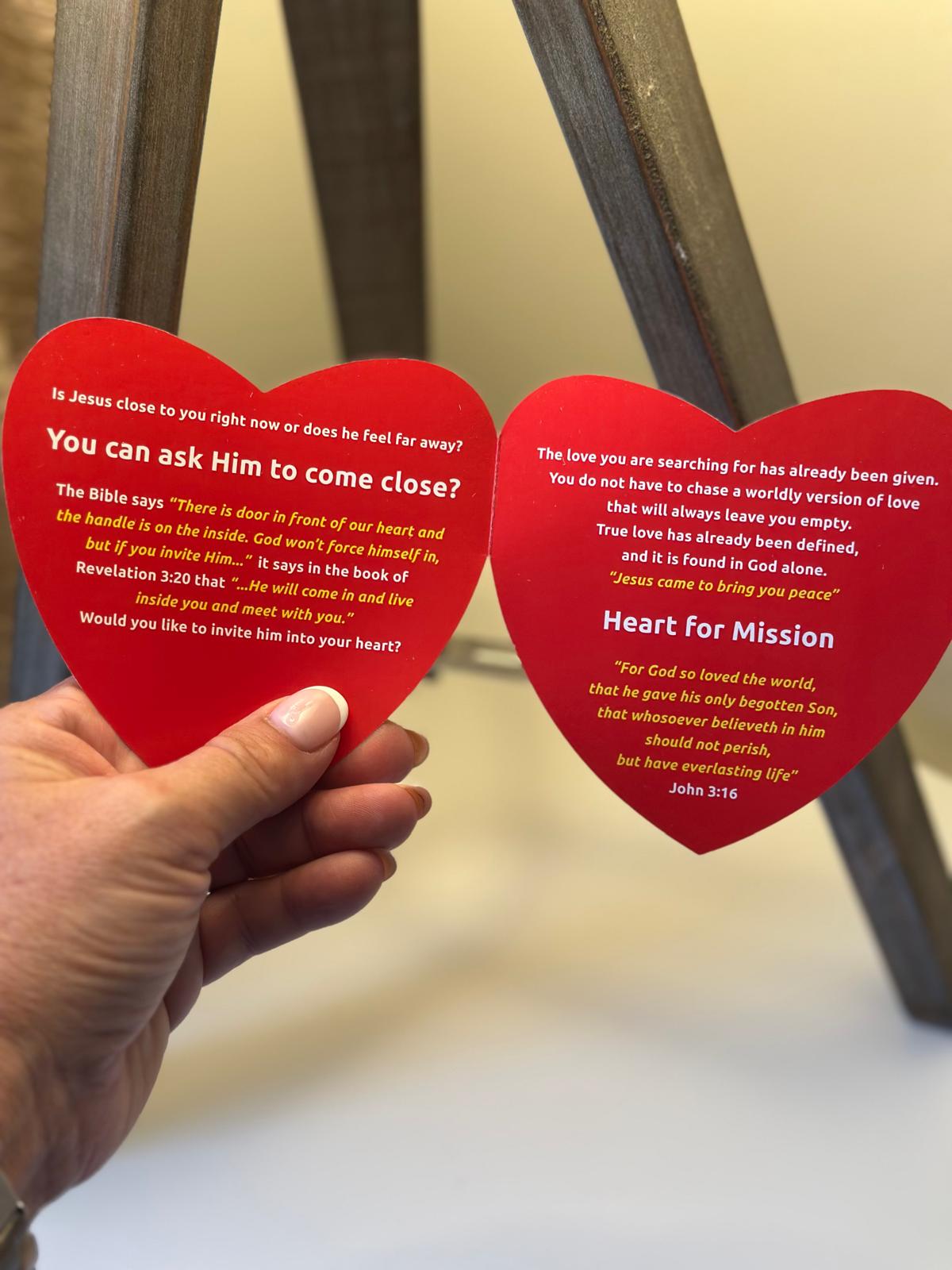 Having a “Heart for Mission” I wanted to come with tract that was a “tool” that is attractive and tactile with a message starting with a question to promoting conversation asking people about Jesus and their relationship. It gives an opportunity to respond, today everyone is looking for answers, take yourself through each page of this heart shaped tool. It defines love, its a choice of opening the door of your heart and letting Jesus in! Jesus came bring you peace and everlasting love